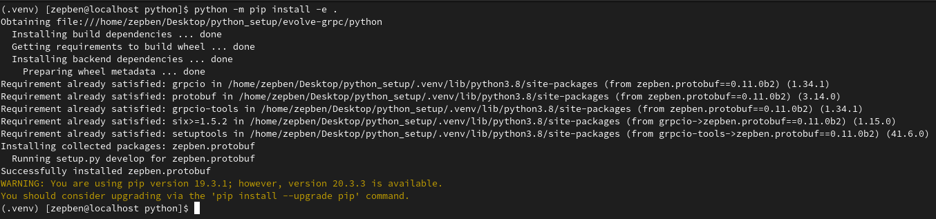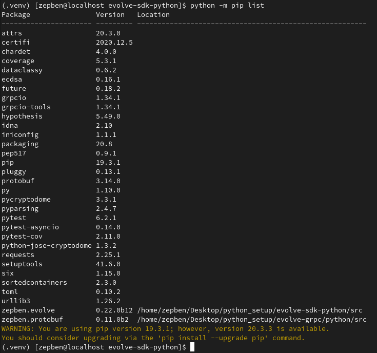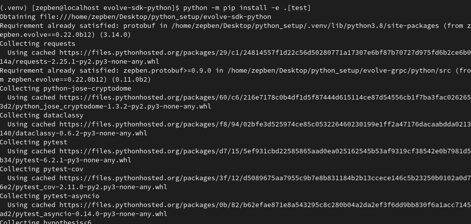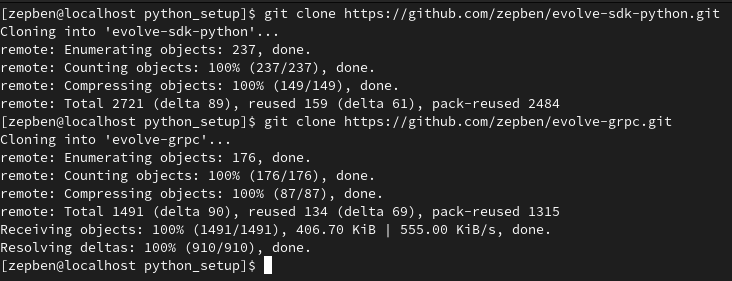 Once you have both repos create a virtual environment that will be shared between them. This will allow you use the your local version of the evolve-grpc as a dependency for the evolve-sdk-python instead of having to rely on the changes for the evolve-grpc to be finalised and deployed.