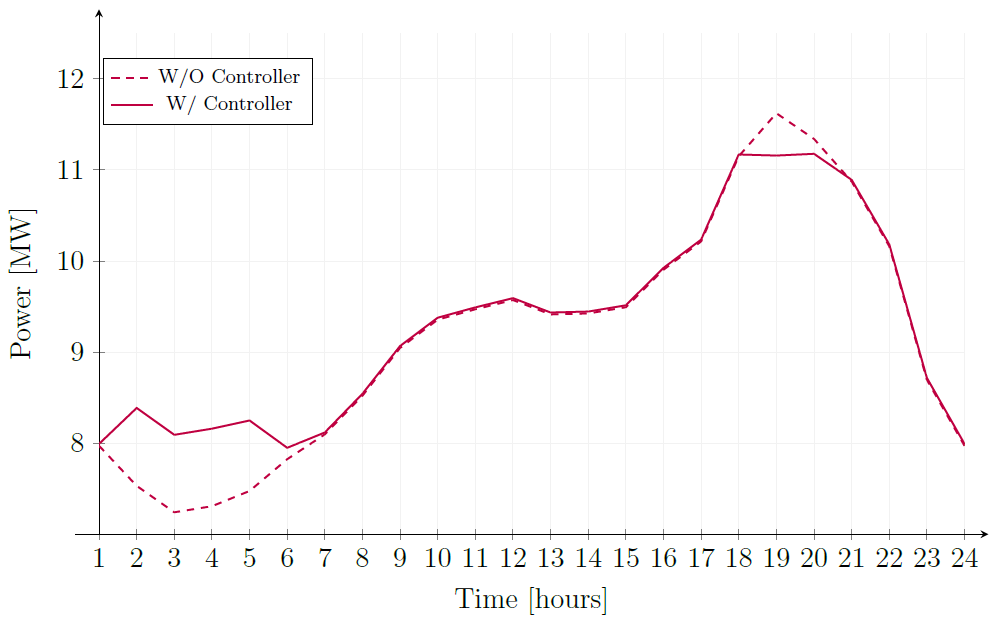 The fleet can shave both the low and high peaks. Note that the charging of the fleet starts at midnight, as the system's loading drops below kw_target_charging at this time step.